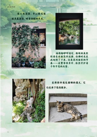 第二日清晨,平江路石板 被晨露濡湿,映着初醒的天光。 摇橹船咿呀划过,船娘的吴歌 软语在水面荡开涟漪,仿佛时光在 此地慢了下来。这是苏州独有的节 奏——在繁华市井中,依然守护着 千年不变的从容。 在西园寺遇见慵懒的猫儿,它 们在廊下悠然踱步。 55