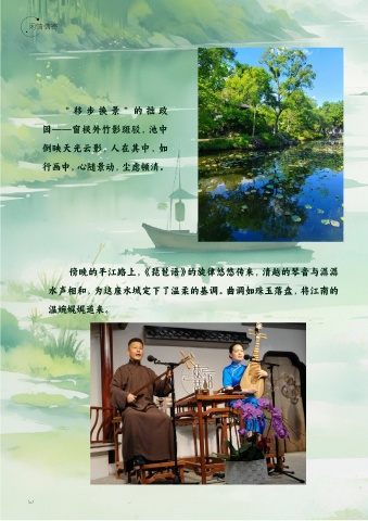 “移步换景”的拙政 园——窗棂外竹影斑驳,池中 倒映天光云影,人在其中,如 行画中,心随景动,尘虑顿消。 傍晚的平江路上,《琵琶语》的旋律悠悠传来,清越的琴音与潺潺 水声相和,为这座水城定下了温柔的基调。曲调如珠玉落盘,将江南的 温婉娓娓道来。 57