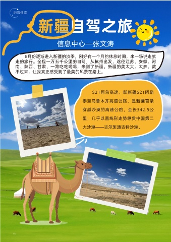 新疆自驾之旅 信息中心—张文涛 8月份逐渐进入新疆的淡季,刚好有一个月的休息时间,来一场说走就 走的旅行。全程一万五千公里的自驾,从杭州出发,途径江苏、安徽、河 南、陕西、甘肃、一路吃吃喝喝,来到了新疆。新疆的美太大,太多,数 不过来,让我真正感受到了最美的风景在路上。 S21阿乌高速,即新疆S21阿勒 泰至乌鲁木齐高速公路,是新疆首条 穿越沙漠的高速公路,全长342.5公 里,几乎以直线形走势纵贯中国第二 大沙漠——古尔班通古特沙漠。 65