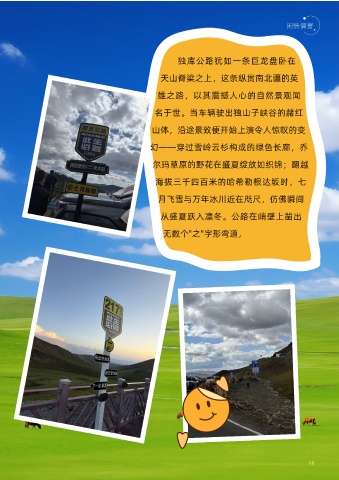 独库公路犹如一条巨龙盘卧在 天山脊梁之上,这条纵贯南北疆的英 雄之路,以其震撼人心的自然景观闻 名于世。当车辆驶出独山子峡谷的赭红 山体,沿途景致便开始上演令人惊叹的变 幻——穿过雪岭云杉构成的绿色长廊,乔 尔玛草原的野花在盛夏绽放如织锦;翻越 海拔三千四百米的哈希勒根达坂时,七 月飞雪与万年冰川近在咫尺,仿佛瞬间 从盛夏跃入凛冬。公路在峭壁上凿出 无数个"之"字形弯道, 68