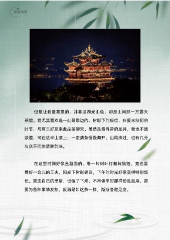 但是让我最喜爱的,并非这湖光山色,却是山间那一方露天 茶馆。我尤其喜欢选一处最靠边的、树影下的座位,在夏末秋初的 时节,与两三好友来此品茶聊天。虽然是最寻常的龙井,我也不通 茶道,可在这半山腰上,一壶清茶慢慢沏开,山风拂过,也有几分 与众不同的清雅韵味。 在这里时间好像是凝固的,看一片树叶打着转飘落,竟也要 费好一会儿的工夫。阳光下树影婆娑,下午的时光好像变得特别悠 长。就连自己的思绪,也慢了下来,不再像平时那样纷乱如麻,需 要为各种事情发愁,反而是如这茶一样,渐渐澄澈见底。 79
